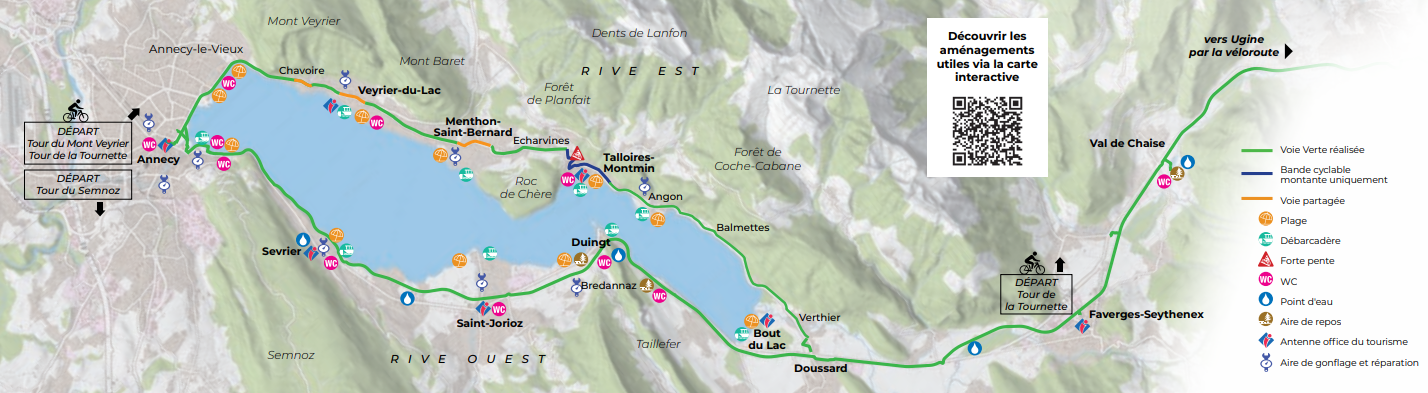 Le tour du lac d’Annecy est l’un des plus beaux itinéraires cyclables de France. Entièrement balisé et majoritairement sécurisé, il alterne pistes cyclables aménagées et portions partagées